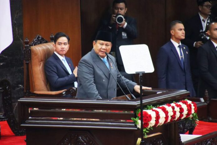 Presiden Prabowo Subianto dalam pidato Sidang Tahunan MPR 2025 di Gedung Nusantara Kompleks Parlemen Senayan, Jakarta, Jumat (15/8/2025).