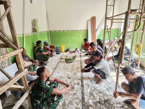 Suasana penuh keakraban mewarnai kegiatan Satgas TMMD ke-126 Kodim 0815/Mojokerto bersama warga Desa Sumbertanggul, Kecamatan Mojosari, saat menggelar syukuran sederhana di lokasi sasaran fisik rehab Mushola Baitul Mukmin, Kamis (30/10).