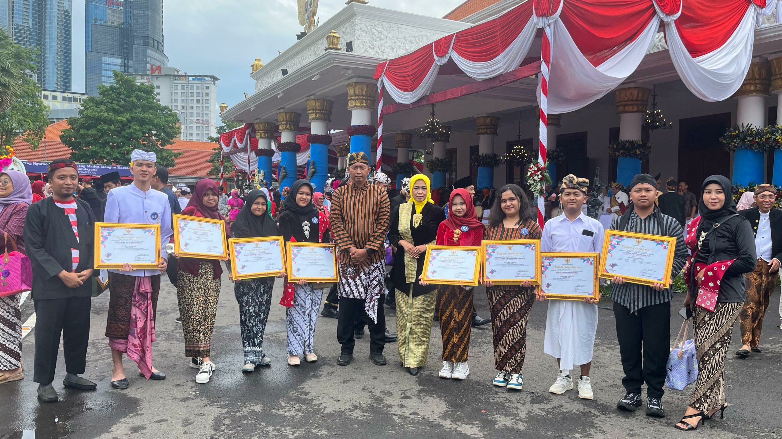 Kepala SMAN 1 Tanggul Jember Marta Mila Sughesti bersama para muridnya yang mendapat penghargaan langsung dari Gubernur Khofifah atas prestasi international di bidang seni lukis.