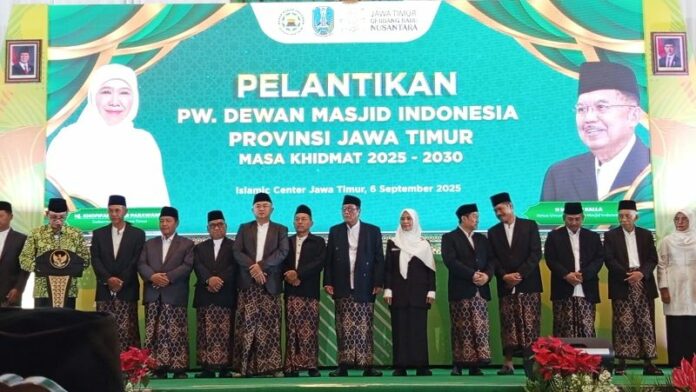 Pelantikan Pengurus Wilayah (PW) Dewan Masjid Indonesia (DMI) Jawa Timur di Aula Islamic Centre Surabaya, Sabtu (6/9/2025).