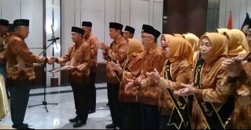 Ketua PWRI Jatim menyerahkan tanda lencana pengabdian dari Pengurus Besar PWRI Pusat, kepada 5 orang anggota, sebagai Pengurus PWRI Kabupaten Sidoarjo, atas pengabdiannya selama 10 tahun. [kus.fen]