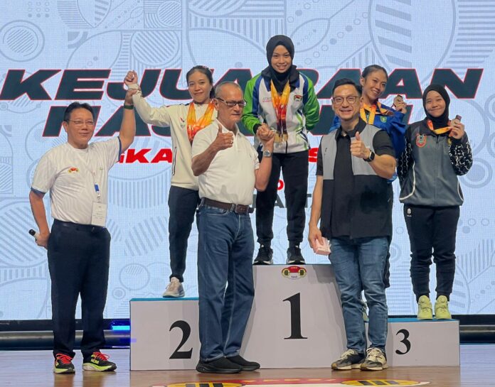 Ketua PABSI Jatim Jeffry Tagore (kanan bawah) pada penyerahan medali yang diraih oleh Lifter putri Jatim Luluk Diana Tri Wijayana yang berhasil merebut tiga medali emas sekaligus gelar the best lifter putri senior tahun 2025 Kejurnas yang digelar di UNY Yogyakarta 13-18 Mei. ist