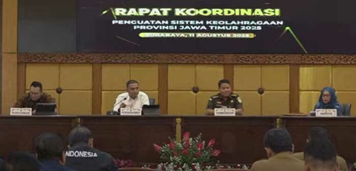 Menindak lanjuti Undang Undang-undang (UU) Nomor 11 Tahun 2022 tentang Keolahragaan dan Peraturan Pemerintah (PP) Nomor 46 Tahun 2024 tentang Penyelenggaraan Keolahragaan, Pemprov Jatim menggelar Rapat Koordinasi Penguatan Sistem Keolahragaan.