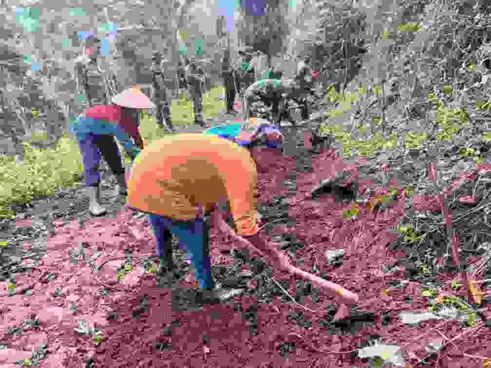 Semangat kebersamaan kembali terlihat di lokasi kegiatan TMMD ke-127 Kodim 0823 Situbondo di Dusun Plampang RT 07 RW 03, Desa Alas Tengah, Kecamatan Sumbermalang, Kabupaten Situbondo, Minggu (22/2). Akibat kondisi jalan yang licin, tidak dapat dilalui kendaraan pengangkut material, ke lokasi TMMD.