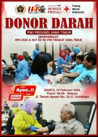 Rangkaian Hari Pers Nasional (HPN) 2026, Persatuan Wartawan Indonesia (PWI) Provinsi Jawa Timur bersama Palang Merah Indonesia (PMI) Kota Surabaya menggelar kegiatan donor darah pada 14 Februari 2025 di Gedung PWI Jatim, Jalan Taman Apsari 15-17 Surabaya.