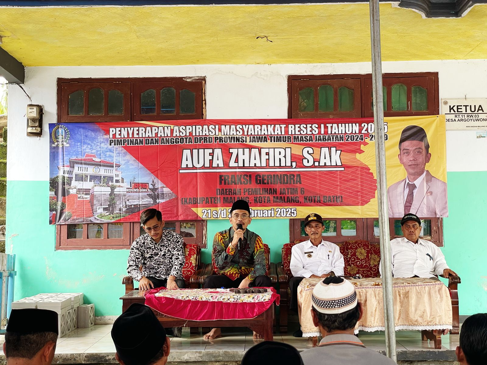 Anggota DPRD Jawa Timur, Aufa Zhafiri, mendapat berbagai aspirasi dari masyarakat saat melaksanakan Reses I Tahun 2025 di Daerah Pemilihan (Dapil) Malang Raya. Dalam kunjungannya ke Desa Majang Tengah, Kecamatan Dampit, Kabupaten Malang, warga menyampaikan sejumlah keluhan dan harapan, terutama terkait pendidikan dan kesejahteraan sosial.