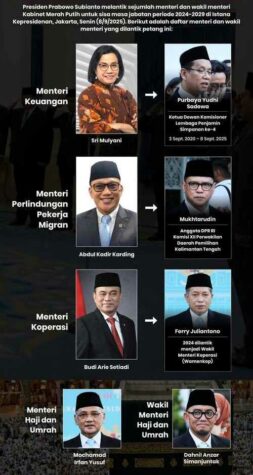 Usia Kabinet Kerja yang dibawahkan Presiden Prabowo Subianto, masih sekitar sebelas bulan, sejak dilantik Oktober tahun (2024) lalu. Tetapi wacana pergantian Menteri (reshuffle) pertama, sudah ramai diperbincangkan. Pergantian Menteri berkait dengan dengan demo besar selama sepekan akhir bulan Agustus 2025. Juga “hasil evaluasi terus-menerus” yang dilakukan Presiden. Lima Menteri yang dirombak termasuk nama besar yang berasal dari kalangan profesional. Juga dari perwakilan parpol.