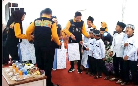 Bupati Sidoarjo Subandi didampingi istri dan Dirut RSUD Notopuro Sidoarjo memberikan bingkisan kepada anak yatim saat peresmian parkir double deck dan renovasi kamar jantung. foto: alikus/bhirawa.