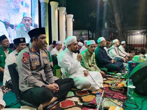Kapolres Situbondo, AKBP Rezi Dharmawan mendampingi sederet kiai dan tokoh masyarakat saat mengadakan kegiatan sholawat bersama Sabtu malam (28/6).n sawawi/bhirawa