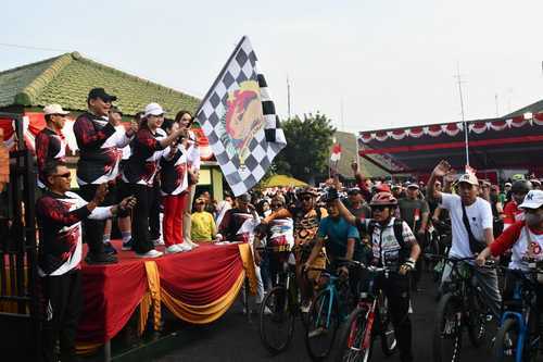 Ribuan warga Mojokerto dan sekitarnya memadati jalanan untuk mengikuti acara Funbike dan Olahraga Bersama yang diselenggarakan oleh Korem 082/CPYJ, yang bertempat di Makorem 082/CPYJ, Jalan Veteran, Kota Mojokerto, Minggu, (10 Agustus 2025).siang