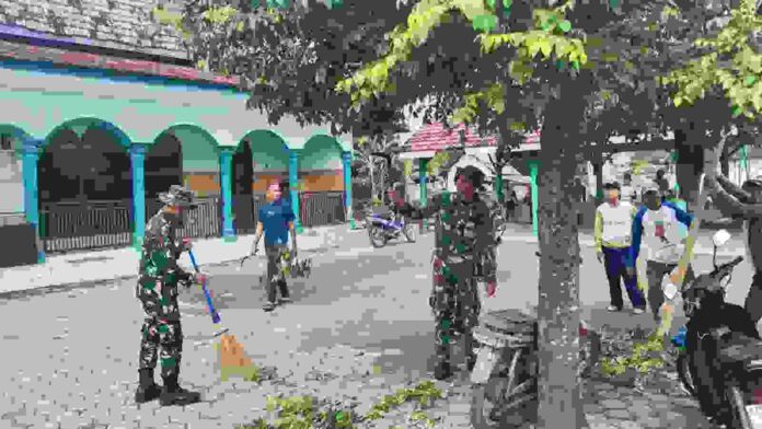 Personel TNI bersama warga bersih-bersih lingkungan Masjid Baitul Huda.