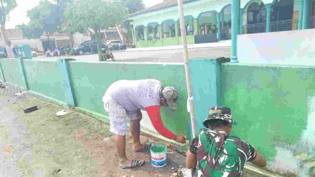 Personel TNI bersama warga mengecat tembok di lingkungan Masjid Baitul Huda.