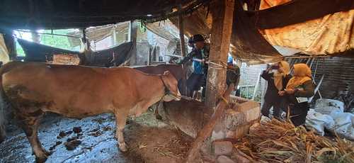 Petugas memberikan vaksin dan vitamin sambil memberikan edukasi mengenai pencegahan penyakit menular pada hewan ternak, termasuk pentingnya kebersihan kandang dan pola pemberian pakan yang baik.