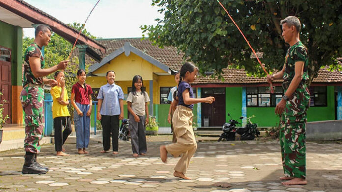 Personel Satuan Tugas (Satgas) TNI Manunggal Membangun Desa (TMMD) ke-127 Kodim 0809/Kediri mengajak anak-anak bermain permainan tradisional di Dusun Sumber Bahagia, Desa Gadungan, Kecamatan Puncu, Kabupaten Kediri.