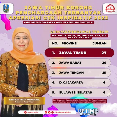 Untuk itu, ia secara khusus berterima kasih kepada seluruh guru, dan tenaga pendidikan di Jatim atas sumbangsihnya yang luar biasa selama ini terhadap dunia pendidikan di wilayah Jatim. Pasalnya seluruh prestasi yang berhasil diraih tak lepas dari upaya dan jerih payah para guru, kepala sekolah dan kegigihan para siswa di Jatim.