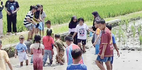 Menilik dari warna kulit dan baju yang dikenakannya, jelas mereka bukan anak desa yang sudah terbiasa main di sawah dan bergelut dengan lumpur. Ternyata, mereka adalah adalah anak-anak perkotaan yang sengaja diajak dan dikenalkan dengan berbagai permainan agar melupakan gadget yang setiap hari menemaninya.