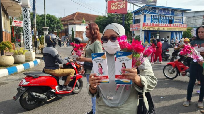 Perserta aksi simpatik memberikan bunga dan leaflet pada pengendara kendaraan di Bundaran TT Kota Tulungagung, Senin (1/12).
