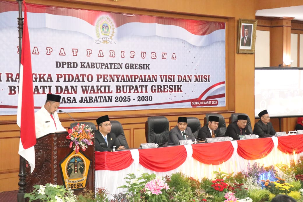 Rapat paripurna DPRD dalam rangka, pidato penyampaian visi dan misi bupati dan wakil bupati Gresik periode Tahun 2025-230. Sebagai langkah perwujudan “Gresik Baru Lebih Maju”, bersama