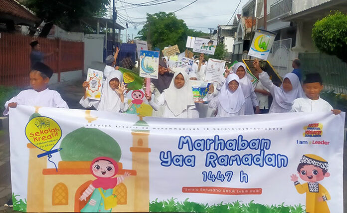 Ratusan siswa Sekolah Kreatif SD Muhammadiyah (SDM) 16 Surabaya bersuka cita mengikuti pawai di jalanan di sekitar Baratajaya dalam menyambut datangnya Bulan Suci Ramadan 1447 H, Jumat (13/2). Para siswa mengenakan berbagai atribut kreatif dan membawa poster buatan sendiri yang berisi ajakan menyambut datangnya Bulan Suci Ramadan kepada warga masyarakat, para siswa menyambut datangnya Bulan Suci Ramadan 1447 H dengan membagikan jadwal Imsyakiyah.