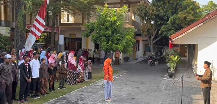 Dengan mengenakan pakaian adat dari beberapa provinsi, puluhan siswa berbaris secara rapi menghadap tiang bendera, begitu juga dengan para guru maupun wali murid turut hadir di upacara yang digelar di halaman SLB Gedangan Sidoarjo.