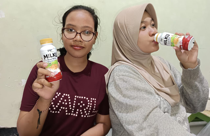 “Pasti ada yang jual MILKU di kantin sekolah, banyak juga teman-teman yang beli. Ya itu tadi murah pas sama uang saku juga buat kenyang,” katanya sambil main game bersama temannya.