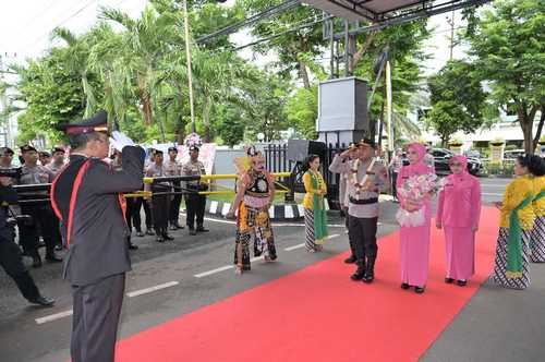 Kedatangan Kapolres Tuban ke-40 beserta Ibu itu disambut dengan tradisi gerbang pora, Rabu (14/1) juga disambut dengan Tari Gambyong Pareanom, sebuah tarian khas jawa tepatnya dari Surakarta yang terkenal dengan gerakan lembut, dinamis dan agun.