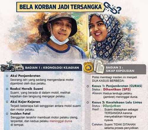 Hogi berhasil mendekat, dan meminta penjambret mengembalikan tas istrinya, tetapi penjambret malah tancap gas motor. Hogi berupaya menempel lagi, penjambret tetap tancap gas, sedangkan di depan tidak ada jalan. Penjambret menabrak tembok sampai terpental. Meninggal di tempat. Menurut paradigma Polres Sleman, terjadi dua kasus. Yakni, penjambretan (pasal 479 KUHP), yang tersangkanya meninggal. Sehingga tutup kasus. Kasus kedua, kecelakaan lalulintas, dengan tersangka Hogi (yang membela istrinya). Penghentian kasus diatur dalam KUHP (baru) pasal