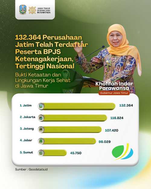 Sebanyak 132.364 perusahaan di Jawa Timur yang terdaftar sebagai peserta BPJS Ketenagakerjaan. Jumlah ini tercatat berdasarkan data Kementerian Ketenagakerjaan RI. Hal ini juga sekaligus membuktikan upaya dan kinerja Pemprov Jawa Timur dalam mewujudkan lingkungan kerja yang sehat membuahkan hasil membanggakan. Alhasil, Jawa Timur sebagai provinsi dengan jumlah perusahaan peserta BPJS Ketenagakerjaan terbanyak di Indonesia pada 2025.