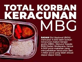 Berita televisi setiap hari mengulas kasus keracunan MBG (Makanan Bergizi Gratis). Keracunan juga dialami ibu-ibu hamil, ibu menyusui, dan guru. Beberapa Pemerintah Daerah kabupaten dan Kota, menetapkan KLB (Kejadian Luar Biasa). Bagai estafet KLB keracunan MBG, setiap hari! Disertai trauma orangtua, dan segenap siswa yang terpapar sakit perut yang ak tertahankan. Presiden Prabowo, tidak boleh menyatakan kasus keracunan “Cuma 0,00017 persen.” Karena di satu daerah terdapat kasus keracunan sampai 11%.