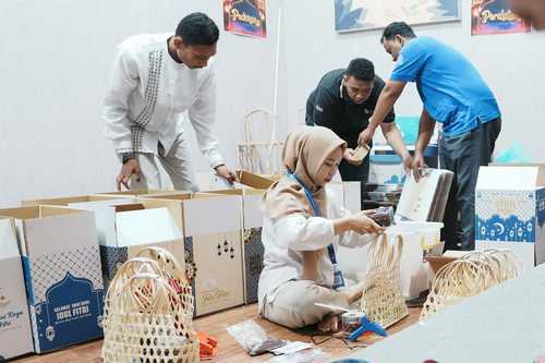 Karyawan Rumah BUMN SIG di Rembang mengisi hampers box dengan produk-produk UMKM Rembang di Galeri RB Rembang.