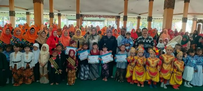 PLT Kadis Pendidikan dan Kebudayaan Kabupaten Situbondo, Fathor Rakhman mendampingi Bunda PAUD, Mbak Una Laili dan Wabup Mbak Ulfi saat peresmian lomba mewarnai dan permainan dakon, di pendopo Aryo, Jumat (16/5). sawawi/bhirawa.
