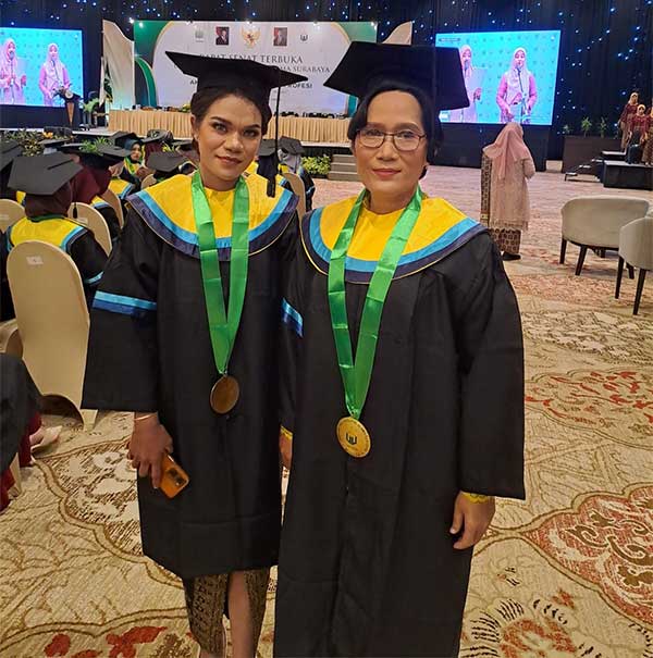 Wisudawan Program Studi S1 Kebidanan Unusa Waryani tercatat sebagai wisudawan tertua, usianya sudah 54 tahun dan sudah mempunyai menantu warga Kanada dan sehari-hari dia bekerja di RS Darmo.