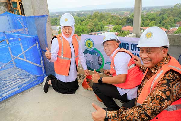 Gubernur Jawa Timur Khofifah Indar Parawansa melakukan topping off atau peletakan mortar konstruksi Pembangunan Gedung Gus Dur RSU Muslimat NU di Kabupaten Ponorogo, Rabu (14/5).