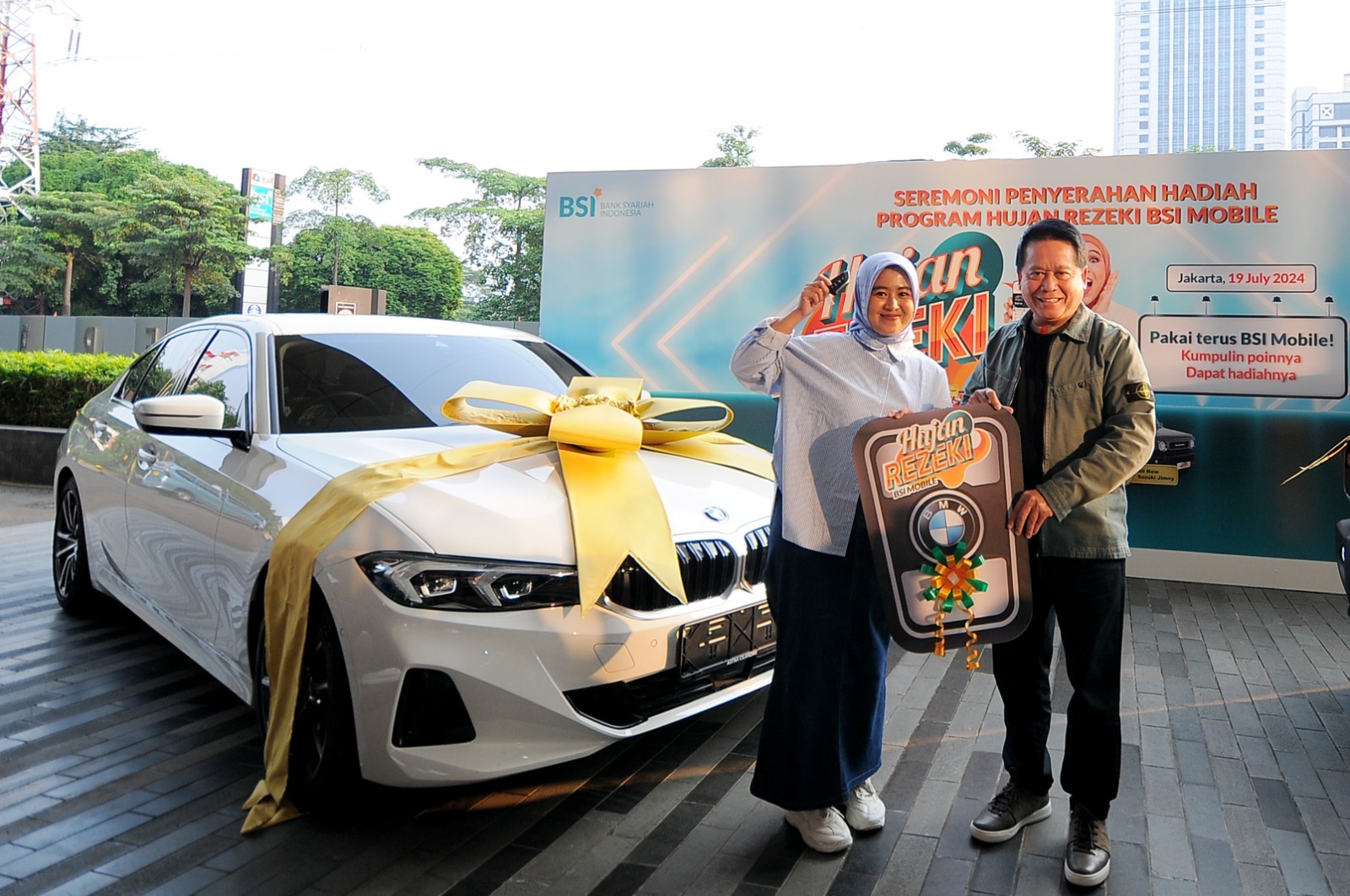 BSI menyerahkan hadiah utama BMW 320i Sport kepada nasabah Siti Rahmawati dan Mobil New Suzuki Jimny kepada M Nur, di Kantor Pusat BSI The Tower Jakarta, Jumat (19/07).
