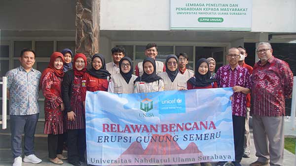 Universitas Nahdlatul Ulama Surabaya (Unusa) memberangkatkan Tim Relawan Bencana untuk membantu masyarakat terdampak erupsi Gunung Semeru. Sebagai bentuk kepedulian sosial dan komitmen dalam misi kemanusiaan, tim yang dikirim berjumlah 12 orang, terdiri dari 10 mahasiswa dan 2 dosen pendamping, dan akan bertugas selama 3-4 hari memberikan layanan kesehatan, pendampingan gizi, serta dukungan bagi kelompok rentan di wilayah bencana, Rabu (26/11).