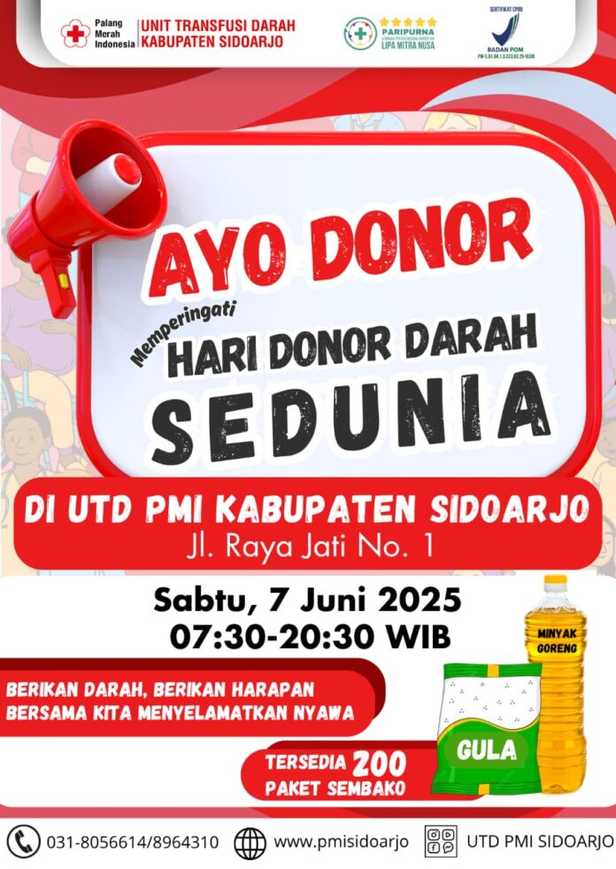 Unit Trasfusi Darah (UTD) PMI Sidoarjo menghimbau partisipasi dari  relawan donor darah, untuk donorkan darahnya pada Hari Donor darah se Dunia, pada  Sabtu 7 juni 2025. Mereka langsung bisa datang ke UTD PMI Sidoarjo, di  jalan raya Jati nomor 1 Sidoarjo.
