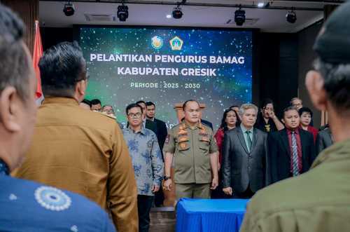Pengurus Badan Musyawarah Antar Gereja (BAMAG) Kabupaten Gresik periode 2025-2030 resmi dilantik, Selasa (15/4). Prosesi pelantikan berlangsung di Gedung Nasional Indonesia (GNI) Gresik dan disaksikan langsung oleh Wakil Bupati Gresik dr. Asluchul Alif, serta dihadiri sejumlah pimpinan organisasi keagamaan, tokoh masyarakat, TNI, dan Polri.