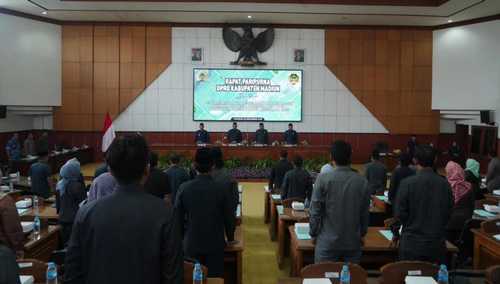 Rapat Paripurna DPRD Kabupaten Madiun dipimpin oleh Wakil Ketua I DPRD Kab. Madiun, Drs. Mujono. M.Si didampingi Wakil Ketua II dan III DPRD Kab. Madiun. Hadir Wabup Madiun, Forkopimda, Sekda Kab. Madiun, Asisten, Staf Ahli Bupati Madiun, Kepala OPD, Camat dan undangan lainnya. [dar.dre]