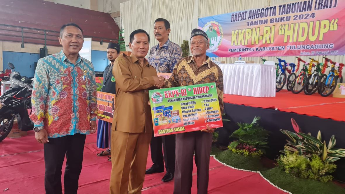Dalam acara RAT Tahun 2024 KKPN RI Hidup Pemkab Tulungagung dimeriahkan dengan pembagian hadiah yang di antaranya berupa sepeda motor. Selain juga pemberian bantuan sosial pada warga kurang mampu dan tempat ibadah. (wed.hel)