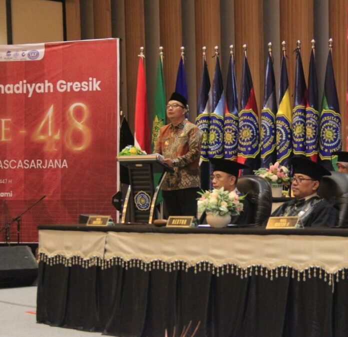 Wakil Bupati Gresik, Asluchul Alif, dalam sambutannya mengajak para lulusan untuk berani menjadi wirausahawan dan mengambil peran strategis di tengah tantangan global yang semakin dinamis.