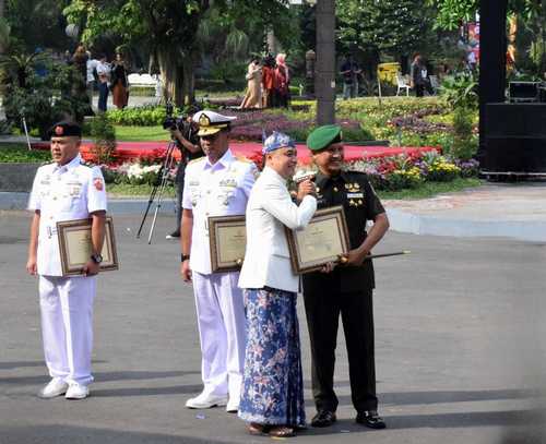 Selain Dandim 0830/Surabaya, Kolonel Inf Didin Nasruddin Darsono. Wali Kota Surabaya juga memberikan penghargaan kepada Danramil 0830/Krembangan, Mayor Inf Slamet Prayitno dan Sertu Singgih dari perwakilan Babinsa, atas partisipasinya dalam penyelenggaraan ketertiban umum dan ketentraman masyarakat di wilayah Surabaya. [bed.dre]